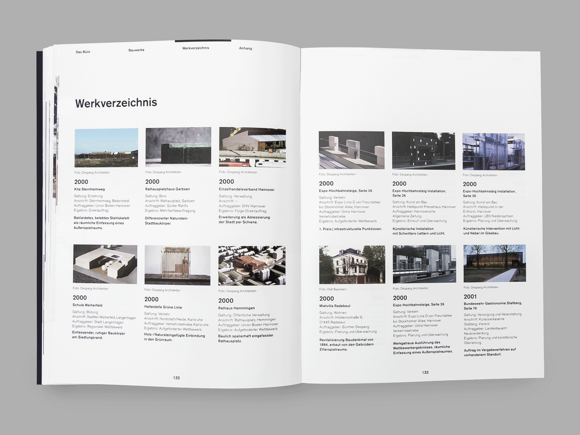 Stitched binding is standard, Swiss brochure binding is also possible. The interview and index are standard sample layouts, the layout is extremely flexible and can accommodate individual projects.
